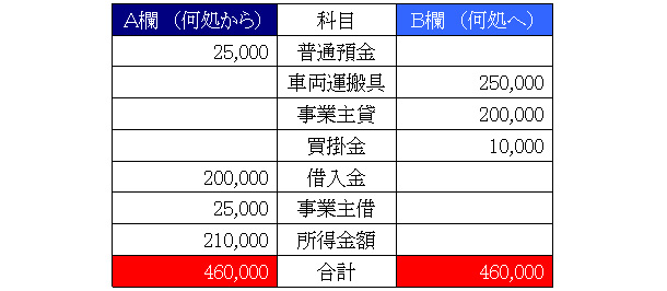 上記のモデルで見ますと所得金額210,000円の範囲に事業主貸200,000円が収まっていますから、所得で生活費が足りたと言えます。タコ配ではありません。また、車両運搬具250,000円は借入金200,000円と預金25,000円及び事業主借(他の所得)25,000円で賄われています。借入金の返済原資は余剰利益(所得金額210,000円と事業主貸200,000円との差額10,000円)と減価償却費(損益計算書から見ます)の合計ですからこの金額と返済予定金額を比べます。この金額が年間返済額に足りていますか?倒産の最大原因である過大設備投資も業績不振もこの表の利用で明らかになるのです。